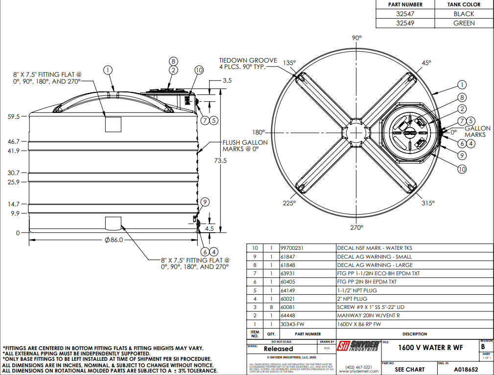 1600gal 86"D x 71"H Poly Water Tank. Tanks are available in Black, Dark Green and Sand (Tan) in sizes up to 3000 gallons, and Black and Dark Green in sizes above 3000 gallons. FOB Shawnee OK