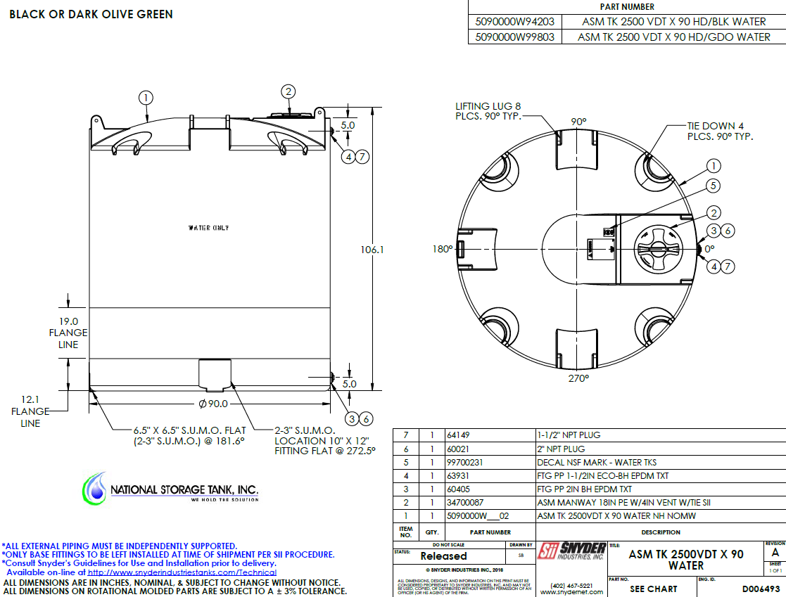 2500gal 90"D x 106"H Green Poly Water Tank. Utilizes State of the art One-piece Seamless Construction For High quality storage capabilities. FOB Phillipi WV