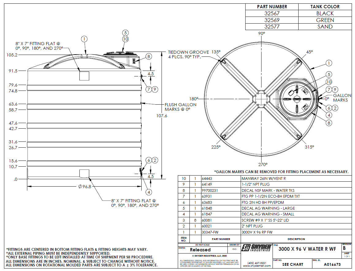 3000gal 96"D x 109"H Poly Water Tank. Tanks are available in Black, Dark Green and Sand (Tan).