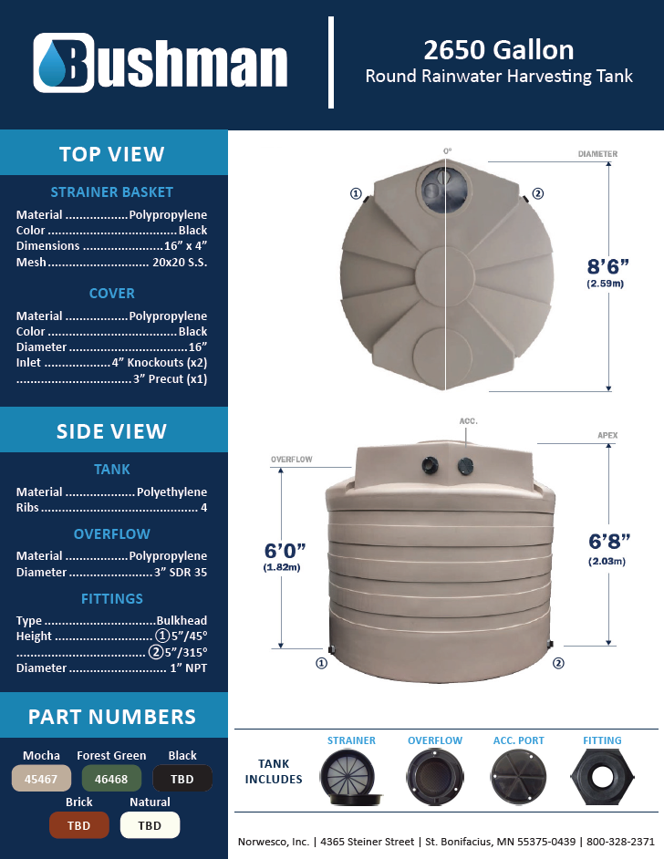 45468 2650gal 102"D x 80"H Rain Harvesting Forest Green Poly Water Tank FOB Merced, CA
